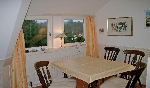 In der Essecke ist ein Tisch mit vier Stühlen. Der Tisch kann ausgezogen werden und bietet dann bis zu acht Personen Platz.